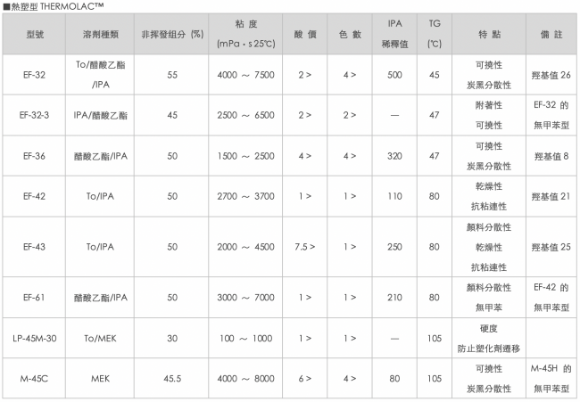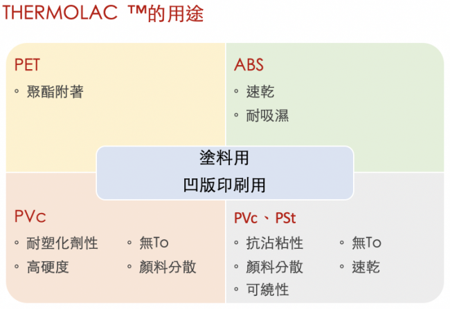 建議將THERMOLAC™作為要求耐熱性、透明性、耐候性的凹版印刷用展色劑。 具體用途可作為覆膜劑用於飲料、飯盒容器等包裝材料的收縮膜、裝飾板膜上, 也可作為雙液型丙烯酸酯改性用塑料透明塗料粘合劑。