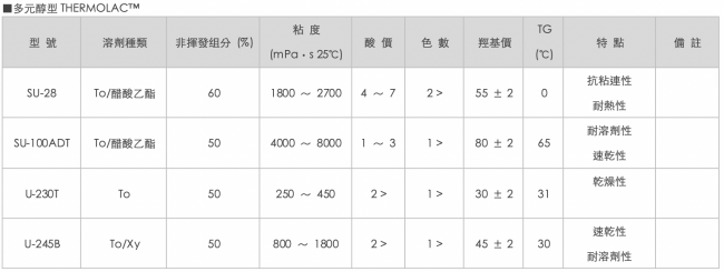 THERMOLAC?是在油墨、塗料用粘合劑中使用的丙烯酸聚合物。根據(jù)不同耐候性、抗污染性、耐藥性、速乾性等性能要求,擁有各自不同型號的產(chǎn)品。還可根據(jù)實際使用環(huán)境來確定溶劑的組成。THERMOLAC ?分為熱塑型、多元醇型兩種類型。